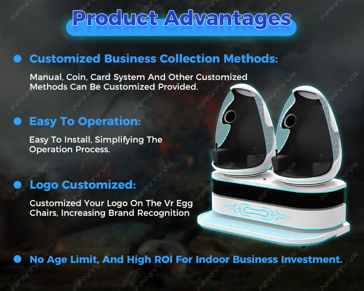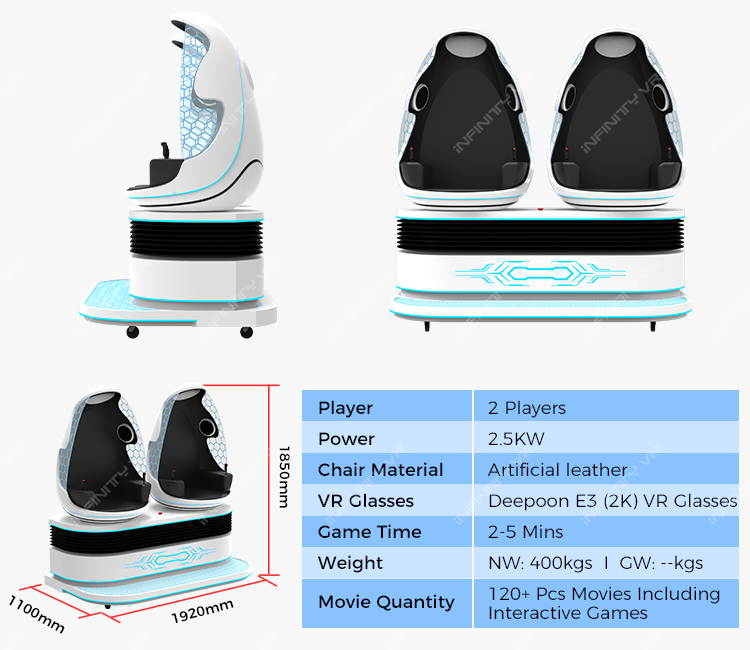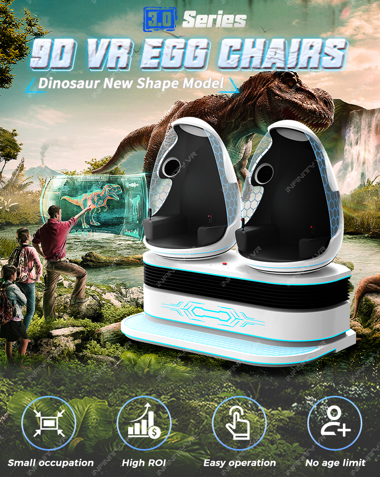 Infinity VR Dino Double Seat Egg Chair is a virtual reality simulator that gives the user a feeling of realism. It renders a high-quality audiovisual and seamless environmental simulation such as windy feels and vibrations.