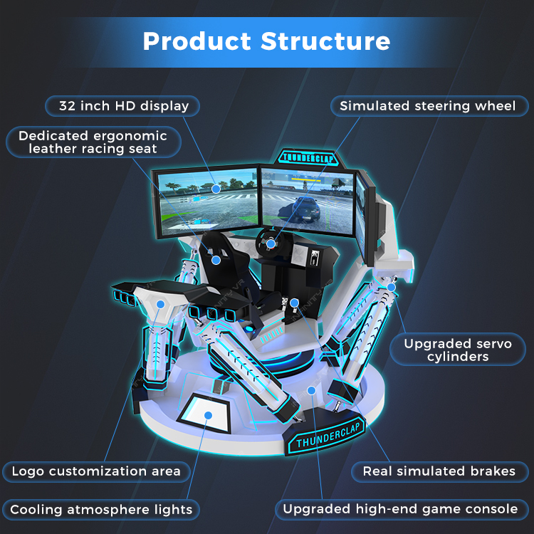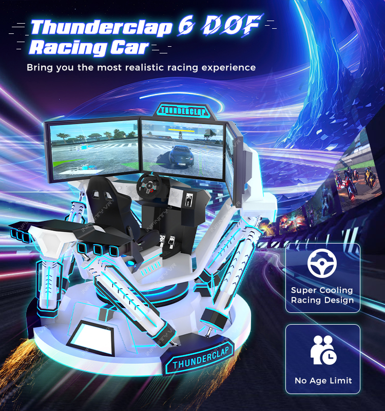 Thunderclap 6 Dof Racing Car is one of the new arrival arcade machines from INFINITY in 2024, which is equipped with 6dof servo cylinders, real simulated racing device like simulated steering wheel and brake