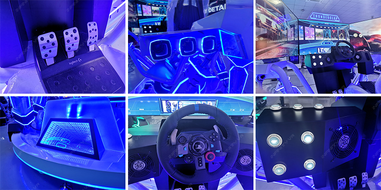Formula-style bodies and actual vehicles, sleek designed glass fiber reinforced steel throughout the surface and alloy wheel strengthen car body, this 1:1 full-size vr car replica houses a custom racing simulator. We can customize your own brand stickers and adjustable brake or accelerator on luxury and modern housing.