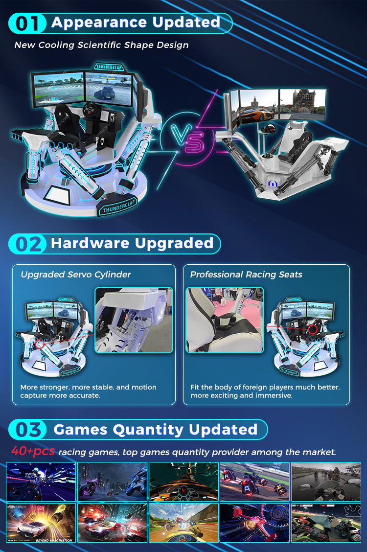 Thunderclap 6 Dof Racing Car is one of the new arrival arcade machines from INFINITY in 2024, which is coming with a super cooling racing design and attractive appearance lights, which have been upgraded from the normal models. It is absolutely a good choice for investment business in shopping mall, inventure game park, arcade park and other gaming malls....besides, it is equipped with the top games quantity, up to 40+pcs racing games among the market. About the hardware configuration, Thunderclap 6 Dof Racing Car is equipped with 6dof servo cylinders, real simulated racing device like simulated steering wheel and brake, which brings the game experiencers a realistic racing journey. Just start your racing journey now!