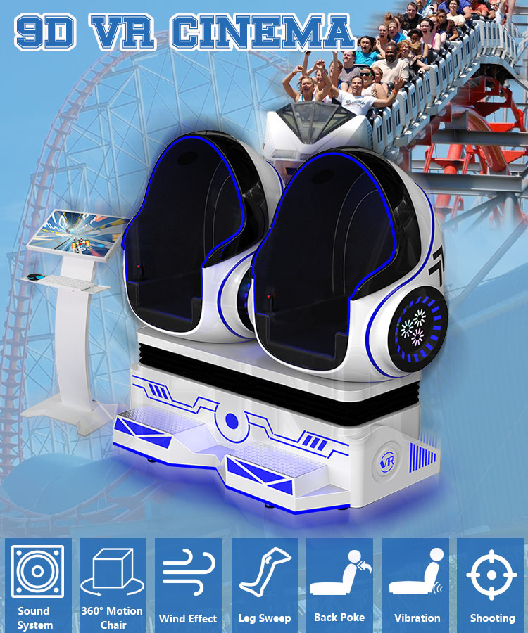 VR Egg Chair is a 9D virtual reality chair that allows VR player to have the most powerful realism sense form the auditory, visual, tactile, as exposure to the movies, through environmental simulation to have wind, air jet, leg tough, back poke, vibration environmental effects, real feeling, immersive and fun.And you also can aim at the target with your head and press the button in the seats to shoot the target in the movies you see in the glasses. We have different kind of movies which will show you the different experience.