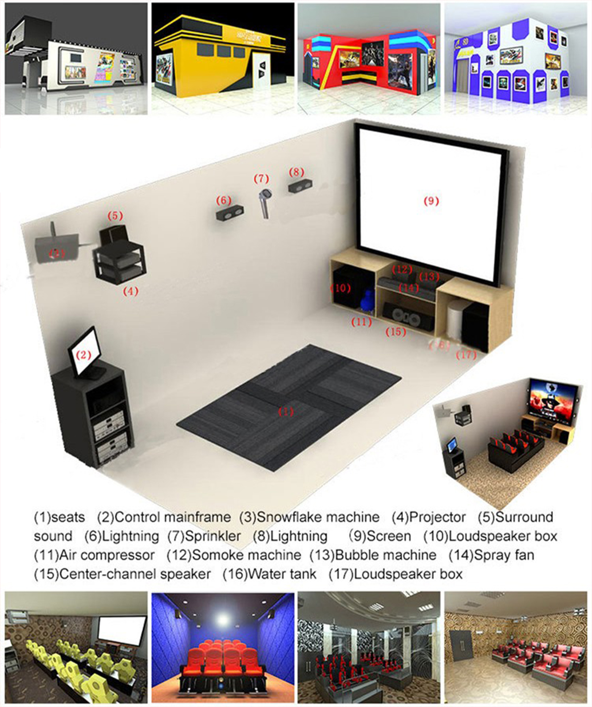 2) 7D cinema system, based on 5D cinema system, adds shooting game interactive technology with shooting guns and ranking system, which upgrade the whole 5D experience.